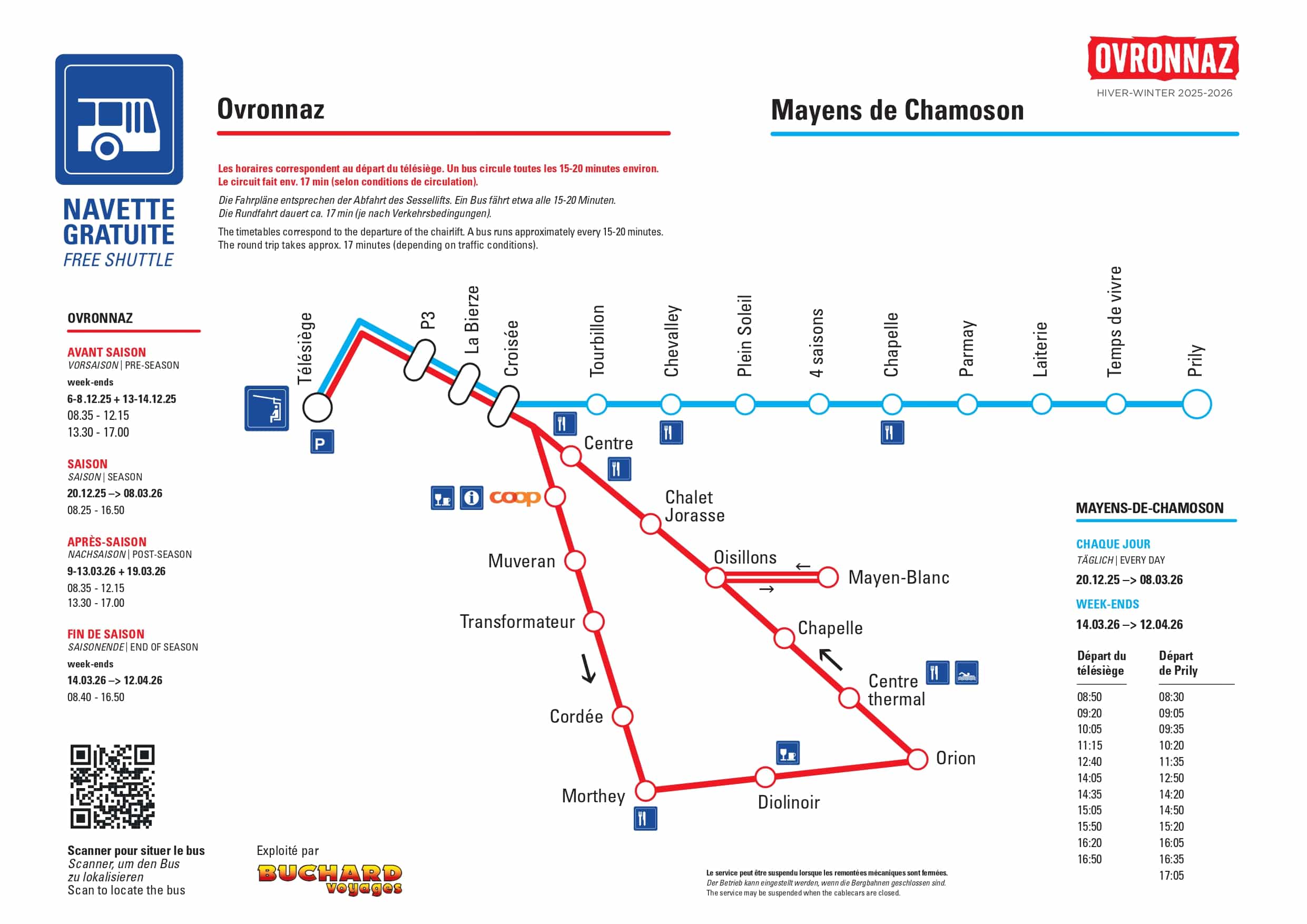 - Gratuité valable uniquement si les voyageurs restent dans le périmètre de gratuité. Dès qu’un voyageur sort du périmètre (ex : il se rend à Leytron), il devra acheter un titre de transport depuis l’arrêt de départ (ex : Ovronnaz, centre thermal Melley) jusqu’à l’arrêt d’arrivée (ex : Leytron, Cave Provins).