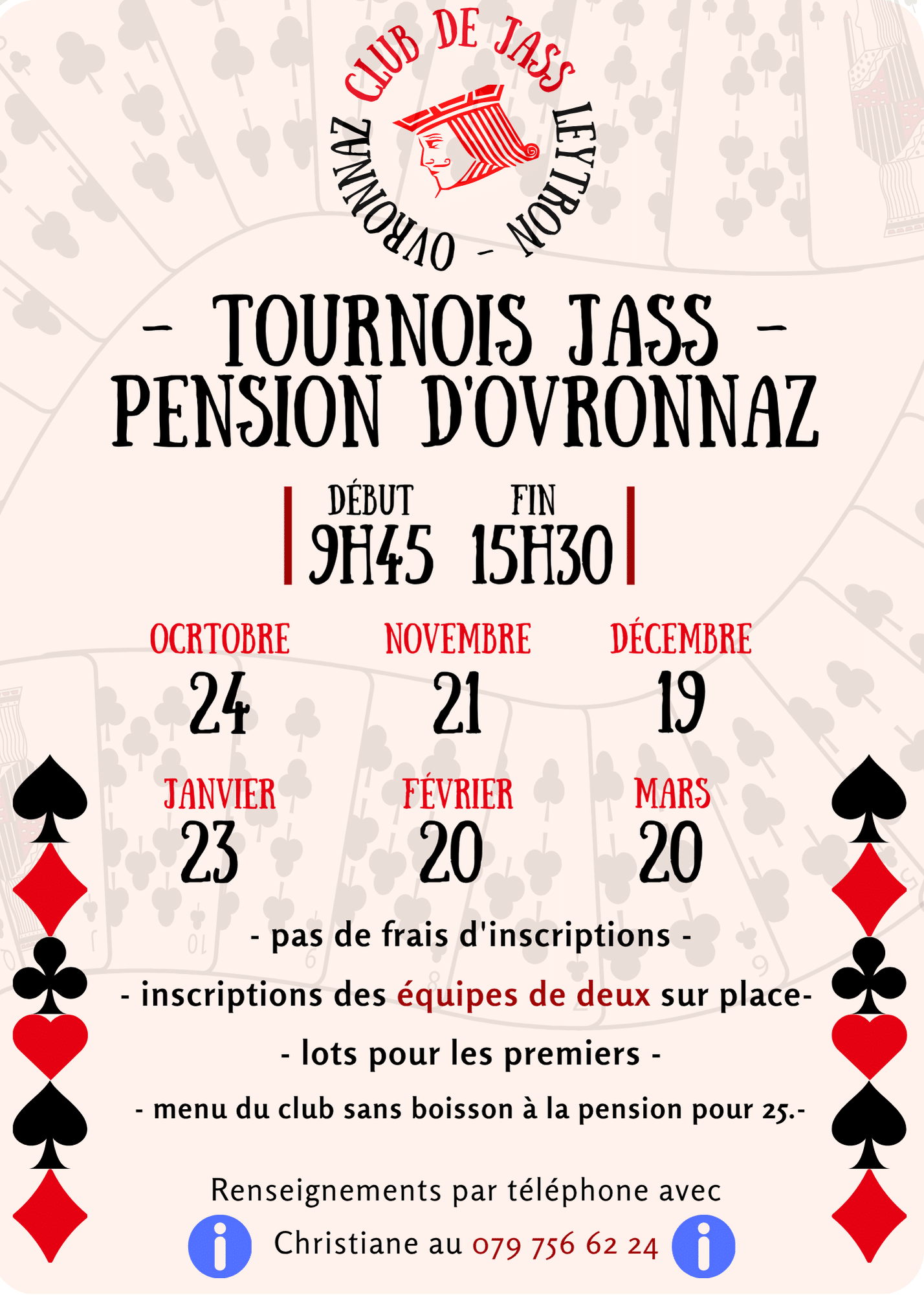 Der Jass-Club der Senioren von Leytron und Ovronnaz freut sich, Sie zu seinen kommenden Jass-Turnieren in der Pension Ovronnaz einzuladen.