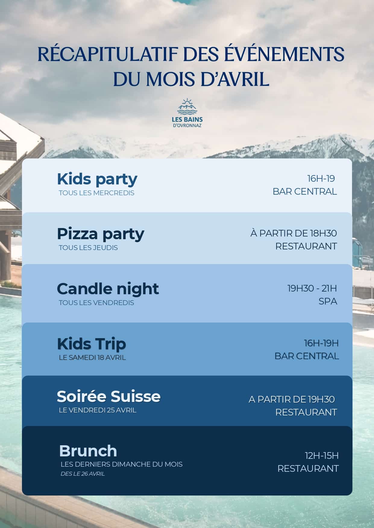 Découvrez le programme des événements des Bains d’Ovronnaz et laissez-vous tenter par des moments uniques entre détente et animations.