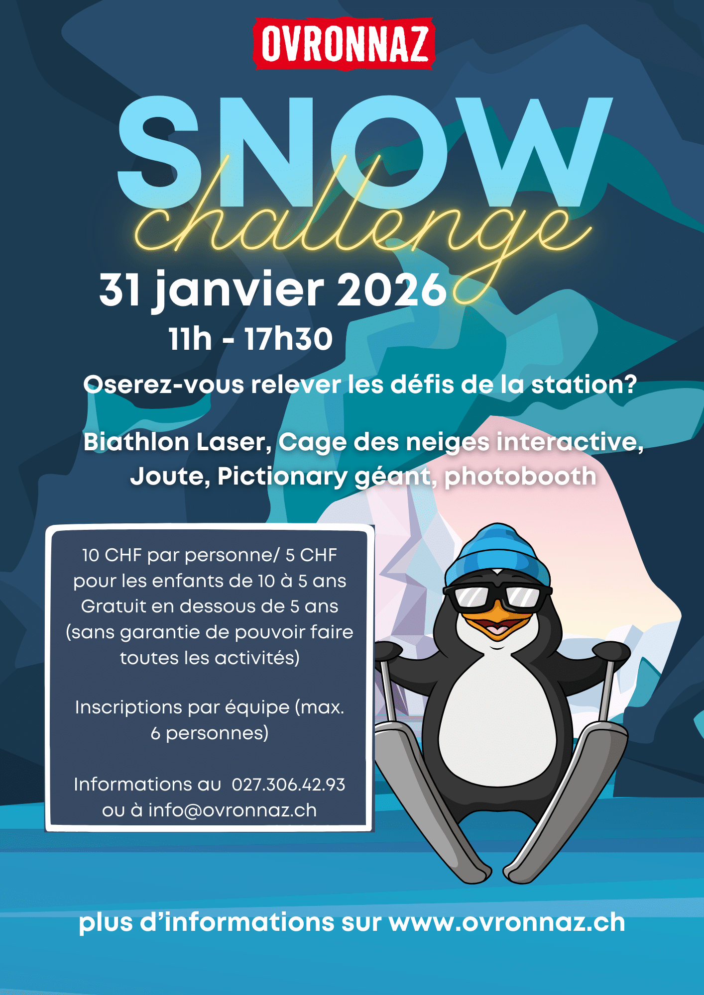 Le 31 janvier s’annonce épique à Ovronnaz avec le Snow Challenge! ❄️🏆 Les équipes auront leur passeport de défis et se lanceront dans une aventure pleine de surprises. 🚀 Des courses endiablées, des épreuves énigmatiques, et même des bonus cachés – tout est prêt pour une journée mémorable! 🎉 Que le décompte commence! ⏳