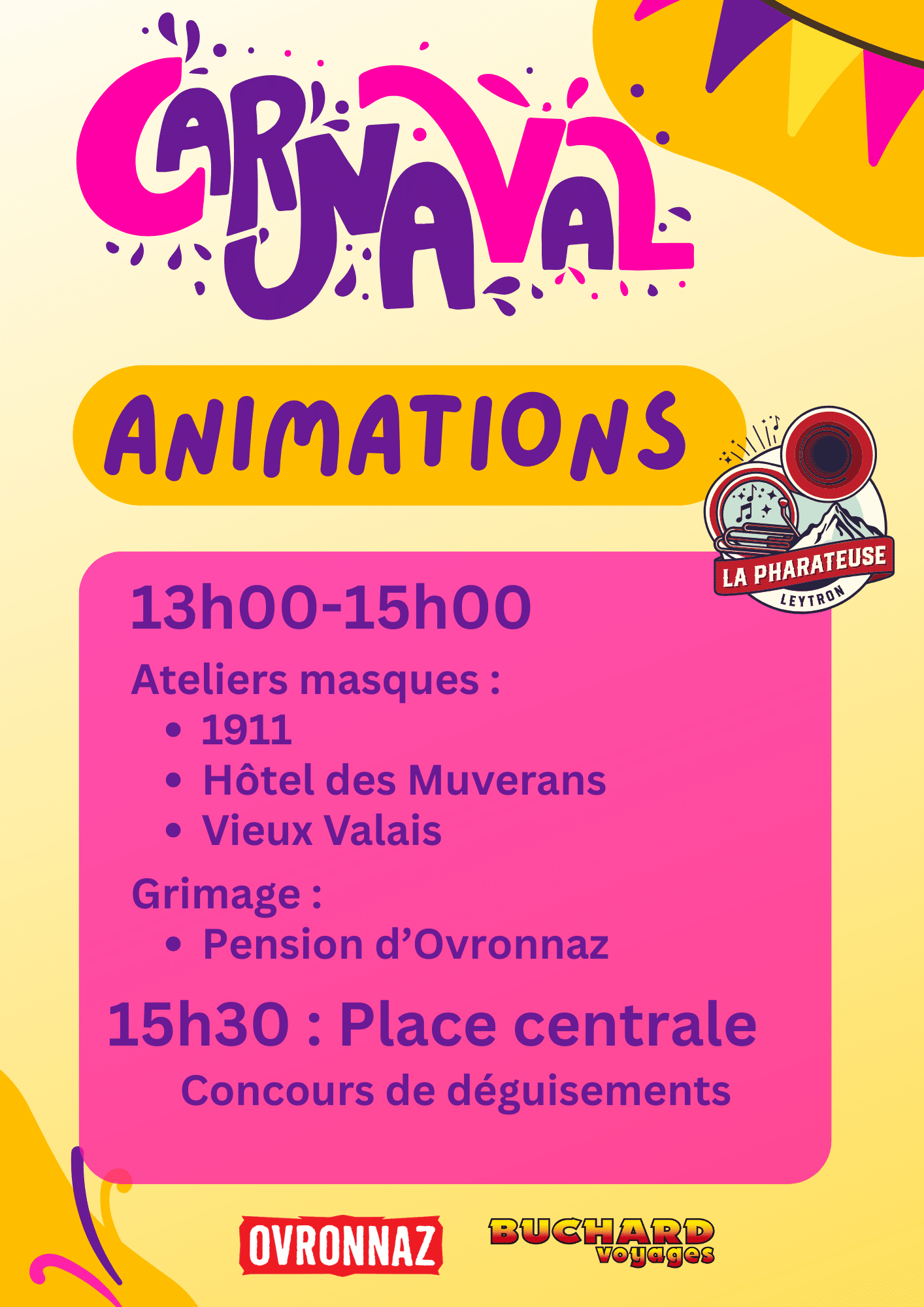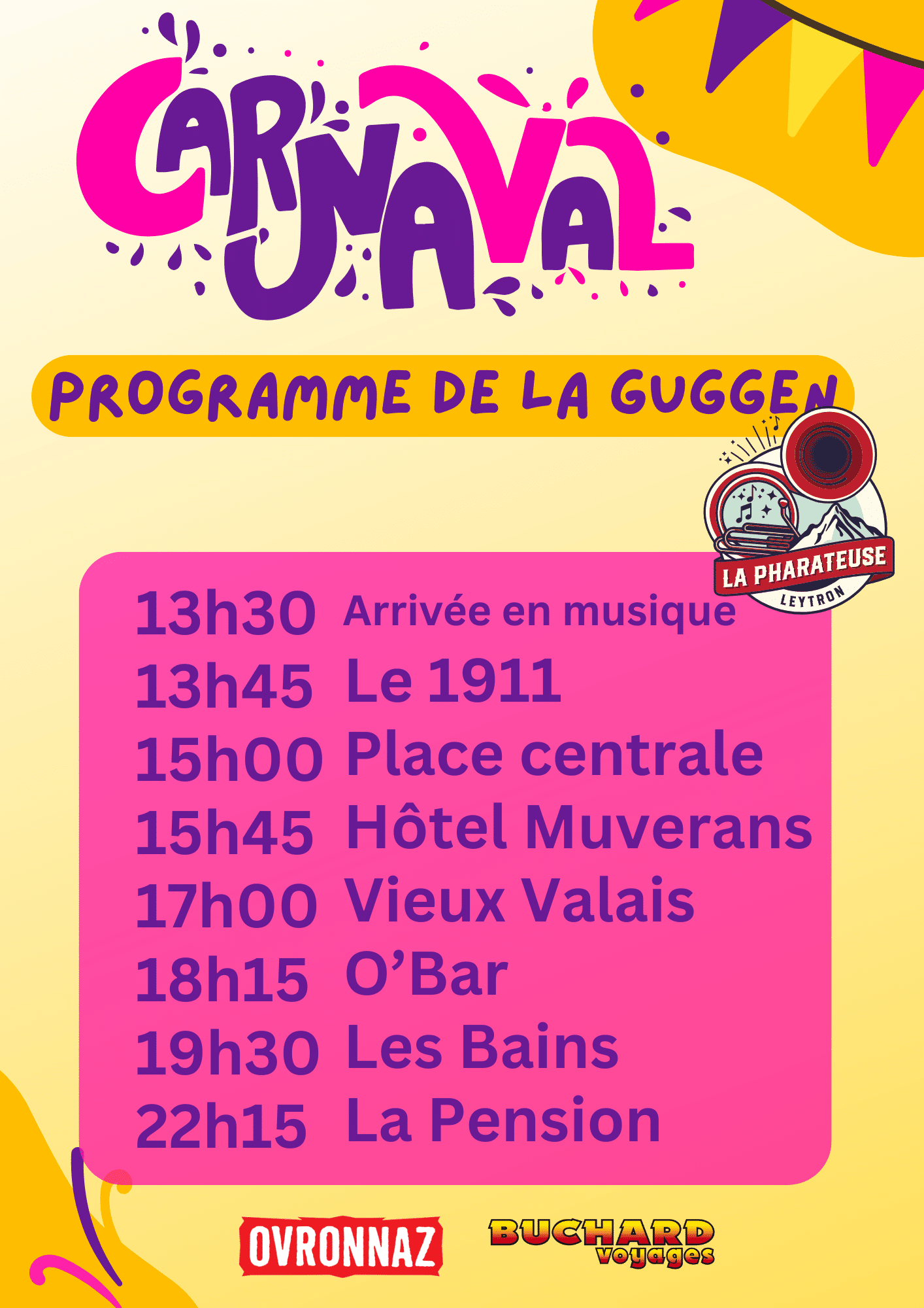 Rendez-vous à la place centrale, Guggen musique, concours de déguisement, cortège, animation dans les bars, confection de masque.