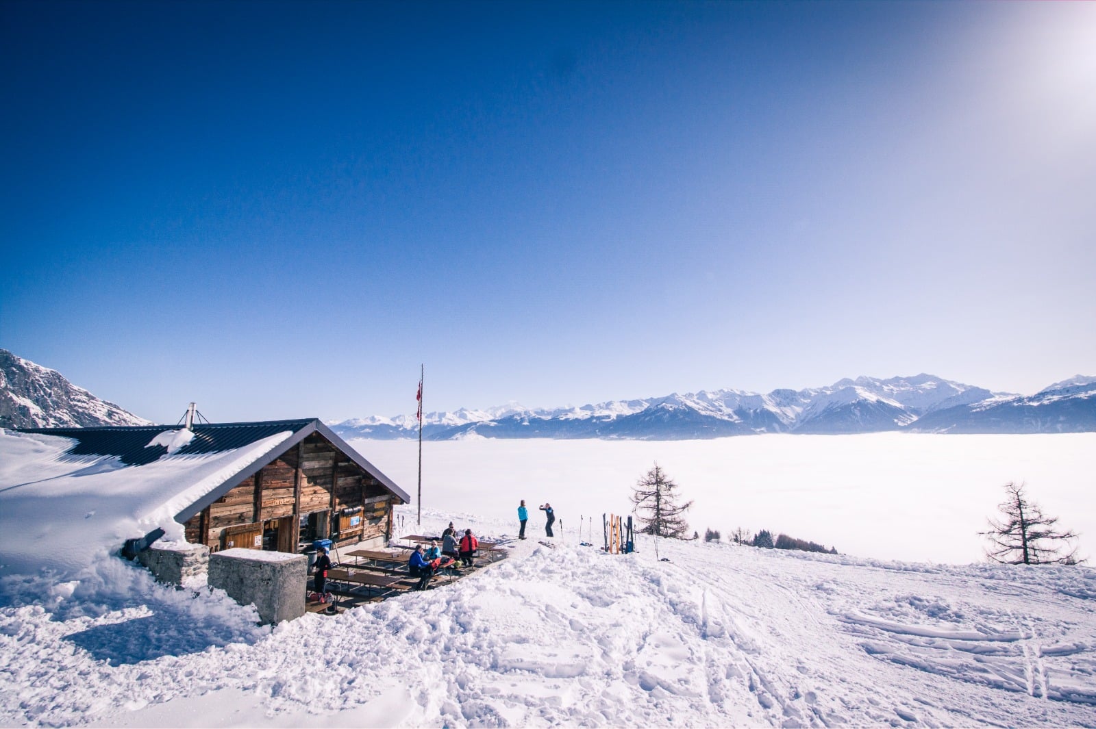 Cette petite buvette au point le plus haut du domaine skiable offre une vue panoramique sur les alpes enneigées.